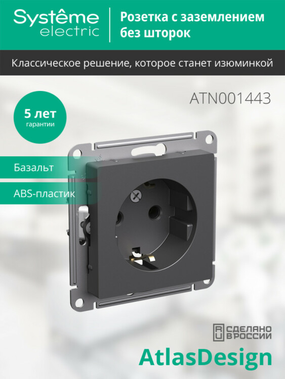 Механизм Systeme Electric (ранее Schneider Electric) серии AtlasDesign в цвете базальт розетки одинарной с заземлением и без шторок подходит для сетей 250 В, на ток 16 А. Заземляющий контакт обеспечивает дополнительную защиту от удара электрическим током. При наличии заземления электрический потенциал уходит в землю, защищая человека. Лицевые детали из качественного ABS-пластика, устойчивого к царапинам и УФ-излучению. Усиленные прямые монтажные лапки для лучшей фиксации механизма в монтажной коробке.