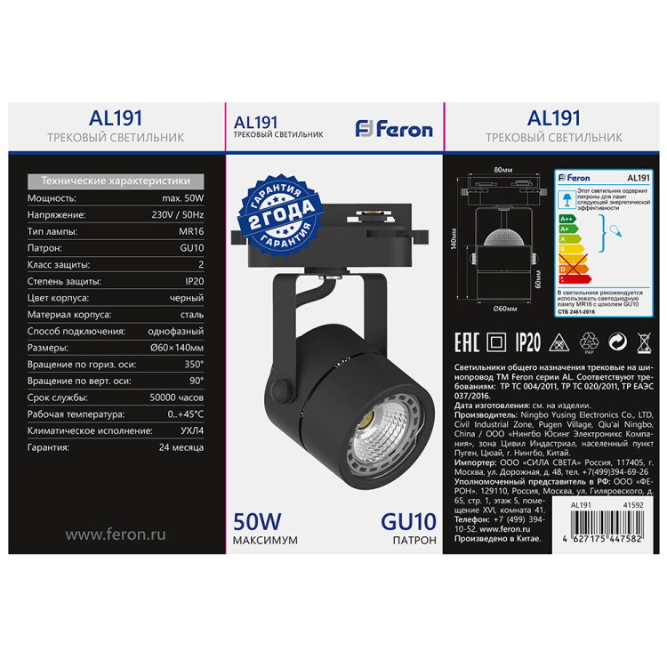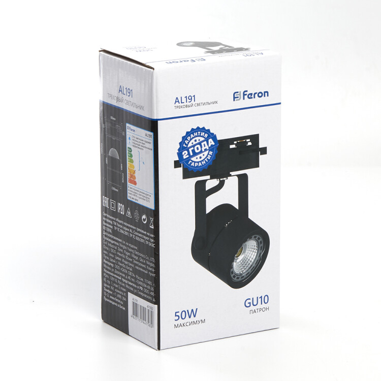 Светильники трековые на шинопровод GU10, однофазный (ИВО) FERON AL191, 50W, 230V, цвет черный, корпус сталь, вращение →350°/↓90°, 60*60*140 мм