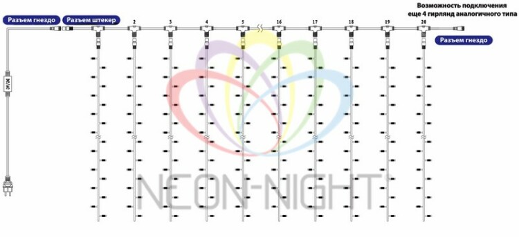 На концах шины располагаются коннекторы, которые предназначены для последовательного соединения нескольких гирлянд в большой занавес для украшения больших площадей или объемных объектов.