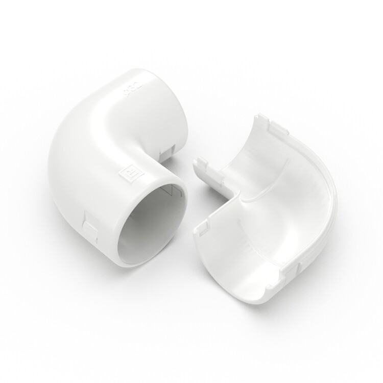 Предназначен для соединения гофрированных труб или гладких труб из пластика под углом 90 °С, что позволяет придать более эстетичный внешний вид местам соединения. Благодаря разъёмному корпусу, имеет возможность установки на уже смонтированную трассу.