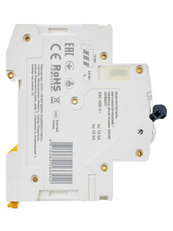Автоматические выключатели ARMAT серии M10N предназначены для защиты цепей от перегрузки и короткого замыкания. Модельный ряд включает в себя устройства с характеристиками срабатывания B, C, D и номинальными токами от 0,5 до 63 А. Номинальная отключающая способность автоматических выключателей ARMAT серии M10N составляет 10 кА. Предельная отключающая способность варьируется в зависимости от номинала от 10 до 50 кА.