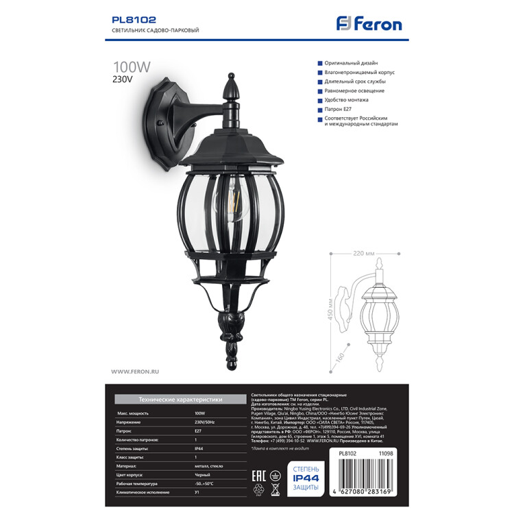 Светильник садово-парковый, серии «Классика», (НБУ) FERON 8102/PL8102 100W, E27, 230V, IP44, цвет черный, 8-и гранник, на стену вниз, 160*220*450мм