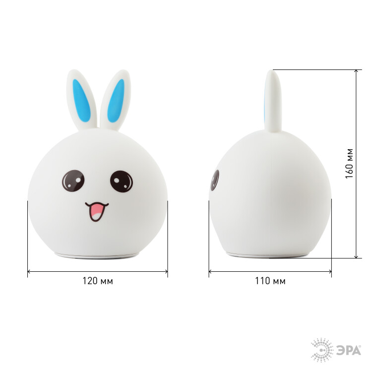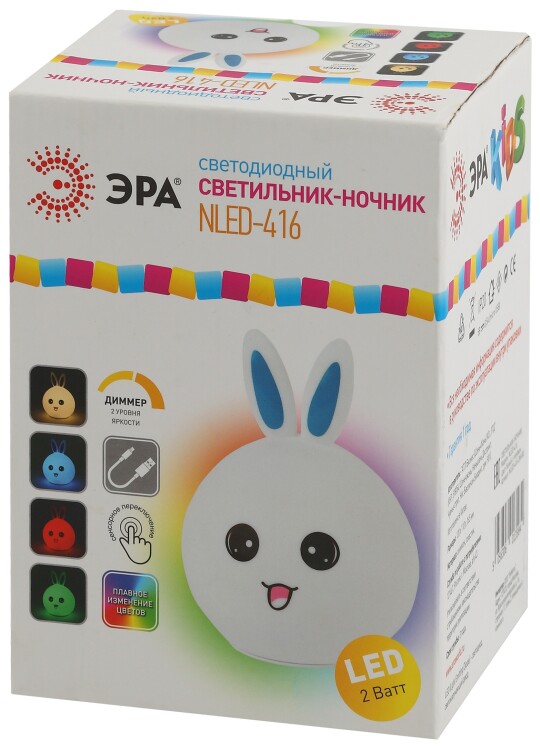 Силиконовая игрушка-ночник ЭРА NLED-416-2W-BU в виде зайчика с восхитительной улыбкой. Этот светодиодный светильник настольный легко впишется в декор спальни, поможет малышу быстро заснуть и сделает уютным интерьер. У светильника-ночника несколько режимов: белый, красный, зеленый или синий цвет свечения на выбор, а также завораживающая смена ярких цветов. Выбирать тип света можно через касание - а делать это вдвойне удобно за счет нежного силикона. Ребенок может мягко сжимать игрушку при переключении цветов: она поможет снять стресс после изнурительного дня. Аккумуляторная лампа-ночник не зависит от проводов: подзарядите его, а потом возьмите с собой в детскую комнату или поставьте в спальню на тумбочку. Выбрав светящегося зайчика от торговой марки ЭРА, вы получите идеальный презент и для себя, и для своего непоседы. Найдите место для верного друга у себя дома.