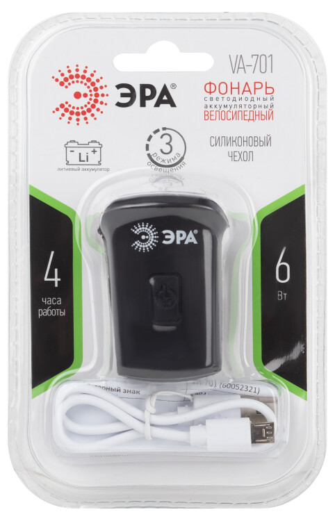 ЭРА VA-701 - эргономичный велосипедный LED-фонарь в силиконовом чехле. Удобно крепится на руль или раму без дополнительных аксессуаров. Работает от встроенного литиевого аккумулятора, подзаряжается от USB (microUSB-кабель в комплекте.). Обеспечит ваши велопоездки качественным ярким светом в трех режимах - 100% яркости, 50% яркости, мигание. Световой поток - 100 Лм. В этом современном велофонаре от торговой марки ЭРА установлены светодиоды нового поколения - не тускнеют и не перегорают в течение всего срока службы. Мощность велофонарика - 6 Вт. От одной полной подзарядки без перерывов светит 4 часа.