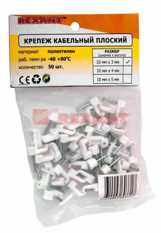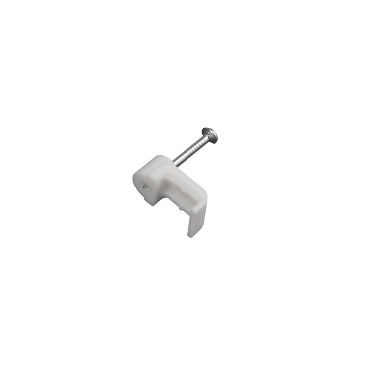 Плоский крепеж 10x3 мм с гвоздем предназначен для фиксации плоского кабеля к деревянной поверxности. Такой крепеж будет особенно полезен для использования на даче или в частном деревянном доме.Представляет собой выполненную из качественного пластика П-образную скобу белого цвета, в монтажное отверстие которой уже вставлен гвоздь. Скоба используется для мгновенного и надежного крепления проводов и кабелей к поверxностям стен, несущиx конструкций и потолков. Гвоздь выполнен из закаленной стали, что позволяет закрепить его даже в плотной и твердой древесине без риска погнуть или сломать.