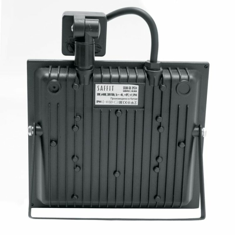 Прожектор светодиодный многоматричный с монтажным креплением на кронштейн, с инфракрасным датчиком движения (ДО) SAFFIT SFL80-50, 50W, 6400К (дневной), 230V/50Гц, 4500Lm, IP44, угол рассеивания 120°,*SMD2835, раб.t -40°C...+40°C, цвет черный, корпус алюминий литой под давлением + стекло, 140*190*50 мм