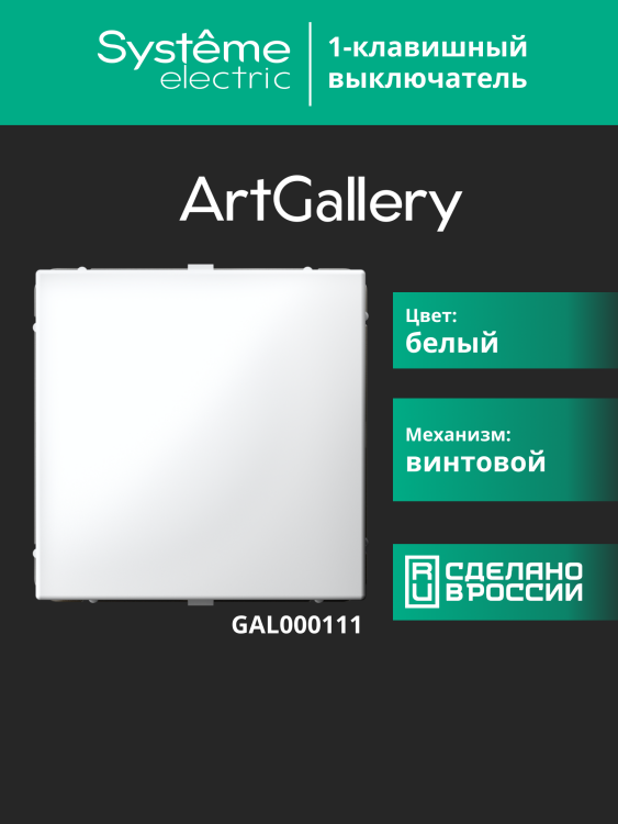 Механизм Systeme Electric серии ArtGallery в цвете белый выключателя 1-клавишного подходит для сетей 250 В, на ток 10 А.