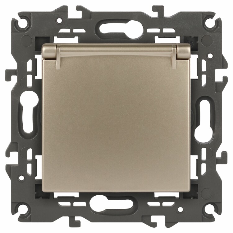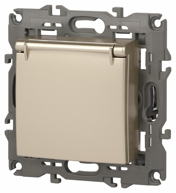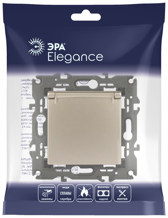 Розетка с заземлением шторки крышка Эра Elegance шампань 14-2103-04. Оснащёна автоматическими клеммами для надёжной фиксации жил кабеля в механизме. Рамки приобретаются отдельно. Рамки Эра Elegance ПЛАСТИК: 1 пост 14-5001-хх, 2 поста 14-5002-хх, 3 поста 14-5003-хх, 4 поста 14-5004-хх, 5 постов 14-5005-хх; СТЕКЛО: 1 пост 14-5101-хх, 2 поста 14-5102-хх, 3 поста 14-5103-хх, 4 поста 14-5104-хх; МЕТАЛЛ: 1 пост 14-5201-хх, 2 поста 14-5202-хх, 3 поста 14-5203-хх, 4 поста 14-5204-хх; ДЕРЕВО: 1 пост 14-5301-хх, 2 поста 14-5302-хх, 3 поста 14-5303-хх, 4 поста 14-5304-хх (хх - код цвета: 00-прозрачный, 01-белый, белёный дуб, 02-слоновая кость, 03-алюминий, 04-шампань, 05-чёрный, чёрное дерево, 07-ясень, 09-дуб, 10-венге, 11-клён, 14-медь, 21-жёлтый, 22-оранжевый, 23-красный, 25-бордо, 26-лайм, 27-зелёный, 28-голубой, 29-синий, 30-розовый, 31-мокко, 32-серый, 41-сталь, 42-титан).