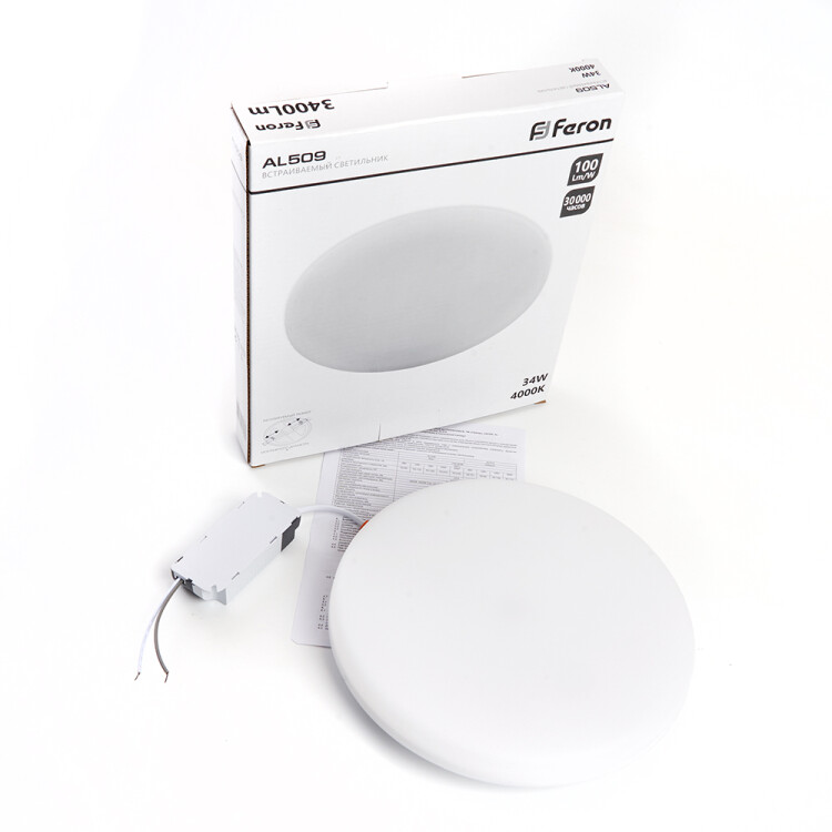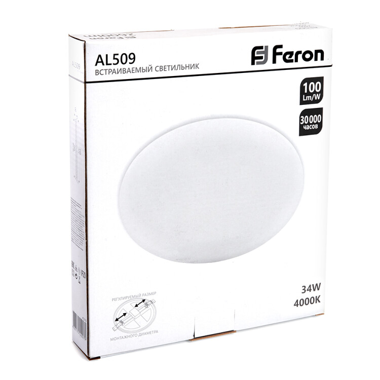 Светильники светодиодные с регулируемым монтажным диаметром, ультратонкий (ДВО) FERON AL509, 34W 4000К (белый), 175-265V, 3400Lm, IP20, угол рассеивания 120°, цвет белый, корпус алюминий, рассеиватель пластик, 225*225*20 мм, монтажн.отв. 70*70 мм.