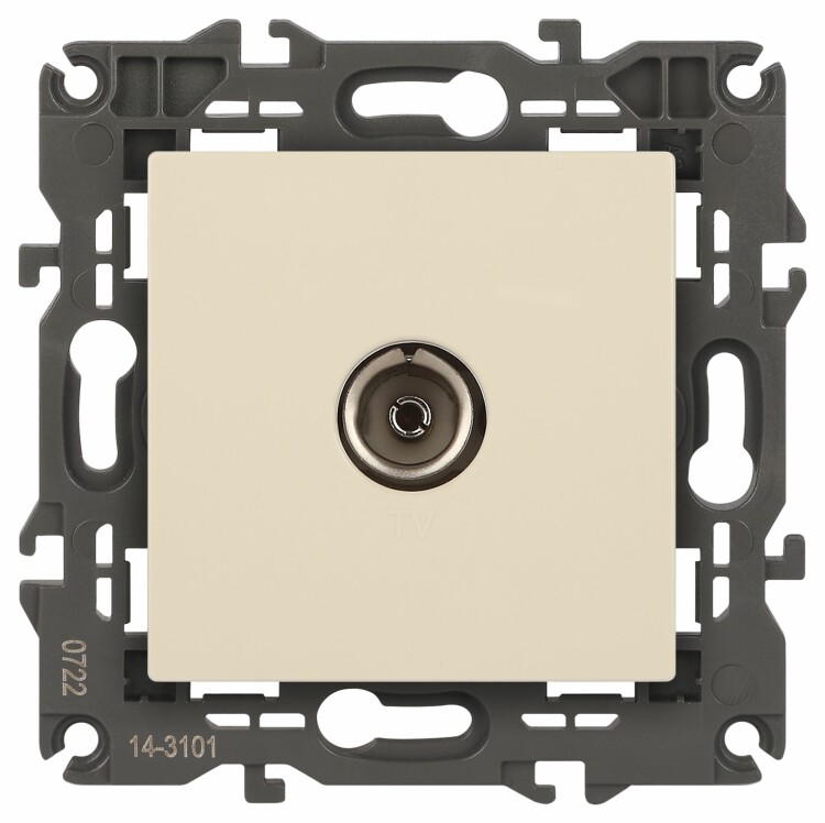 Розетка телевизионная одиночная серии Эра Elegance цвет слоновая кость 14-3101-02. Рамки приобретаются отдельно. Рамки Эра Elegance ПЛАСТИК: 1 пост 14-5001-хх, 2 поста 14-5002-хх, 3 поста 14-5003-хх, 4 поста 14-5004-хх, 5 постов 14-5005-хх; СТЕКЛО: 1 пост 14-5101-хх, 2 поста 14-5102-хх, 3 поста 14-5103-хх, 4 поста 14-5104-хх; МЕТАЛЛ: 1 пост 14-5201-хх, 2 поста 14-5202-хх, 3 поста 14-5203-хх, 4 поста 14-5204-хх; ДЕРЕВО: 1 пост 14-5301-хх, 2 поста 14-5302-хх, 3 поста 14-5303-хх, 4 поста 14-5304-хх (хх - код цвета: 00-прозрачный, 01-белый, белёный дуб, 02-слоновая кость, 03-алюминий, 04-шампань, 05-чёрный, чёрное дерево, 07-ясень, 09-дуб, 10-венге, 11-клён, 14-медь, 21-жёлтый, 22-оранжевый, 23-красный, 25-бордо, 26-лайм, 27-зелёный, 28-голубой, 29-синий, 30-розовый, 31-мокко, 32-серый, 41-сталь, 42-титан).