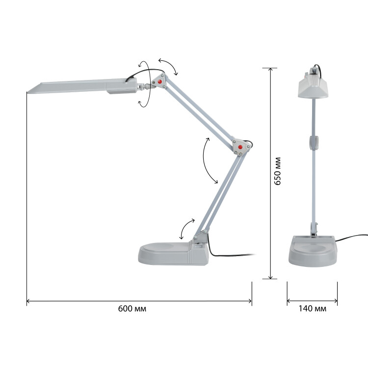 Высота плафона регулируется двухсекционной сгибающейся стойкой, направление света регулируется поворотом плафона в любом направлении под любым углом.