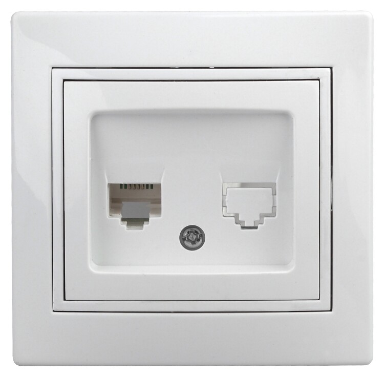 Розетка RJ45 серии Intro Plano скрытой установки цвет белый 1-303-01. Номинальные характеристики . Розетка выполнена из те рмопласта, укомплектована одноместной рамкой. Для установки 2-х и более устройств в несколько подрозетников в ряд дополнительно используются многоместные рамки: 2-х постовая - 1-502-хх, 3-х постовая 1-503-хх, 4-х постовая - 1-504-хх (где хх - цветовой код: 01 - белый, 02 - слоновая кость, 03 - алюминий, 04 - шампань, 05 - антрацит, 10 - венге, 11 - сосна).
