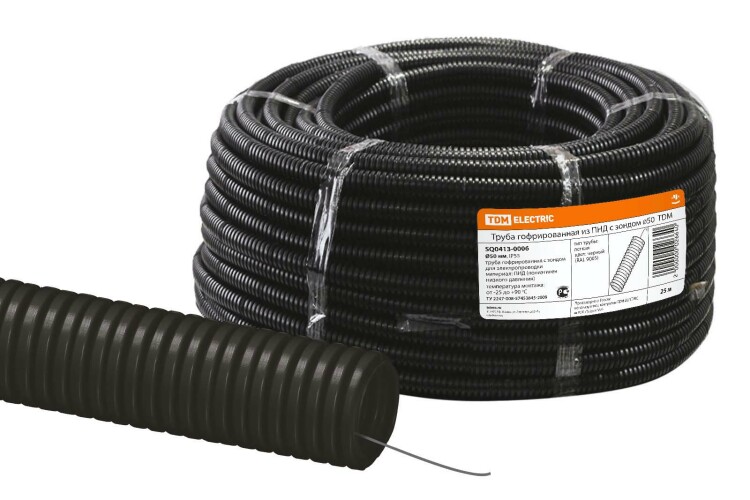 Материалы:Полиэтилен низкого давления (ПНД)Протяжка стальная проволока класса 2 диаметром 0,9 мм Преимущества:Материал - композиция ПНД- позволяет проводить электромонтажные работы в широком диапазоне температур от -45С до +90С без потерь механических и изоляционных свойств.Трубы из ПНД имеют высокие прочностные характеристики, которые позволяют использовать их при прокладке как в бетоне, так и в грунте. При этом гофротруба из ПНД обладает высокой гибкостью и пластичностью.Наличие зонда обеспечивает удобство протяжки кабеля и провода.Назначение:Предназначены для прокладки кабеля при монтаже проводки скрытым/открытым способом в стенах (по стенам), потолках, в полах и т.д. 0: Материалы:Полиэтилен низкого давления (ПНД)Протяжка стальная проволока класса 2 диаметром 0,9 мм