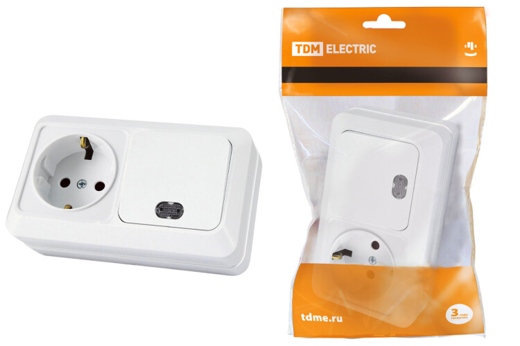 TDM Блок комбинированный выкл. 1-кл. с/п 10А + розетка 2П+З 16А 250В БКВР IP20 белый "Ладога".