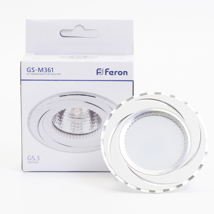 Светильник потолочный встраиваемый (ИВО) FERON GS-M361W, под лампу MR16 G5.3, белый-хром, круг, 80*80*25 мм, монтажный диаметр 57мм, корпус металл, неповоротный
