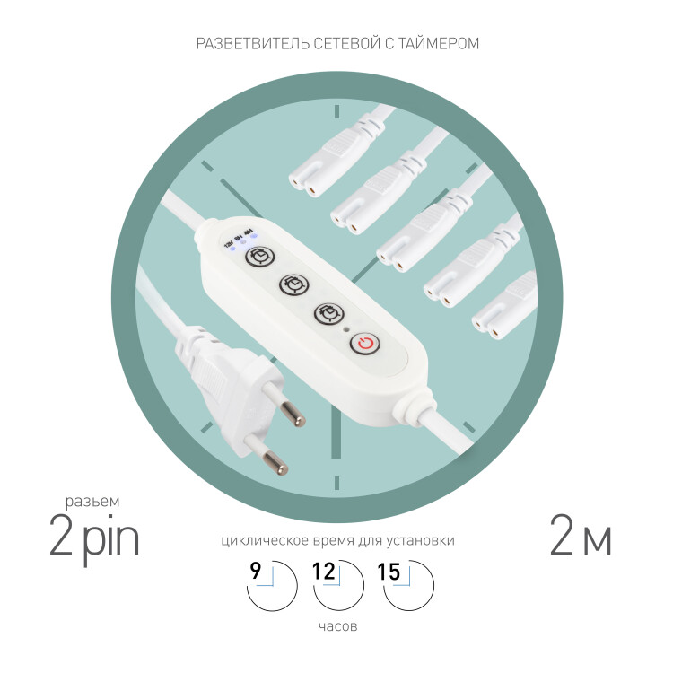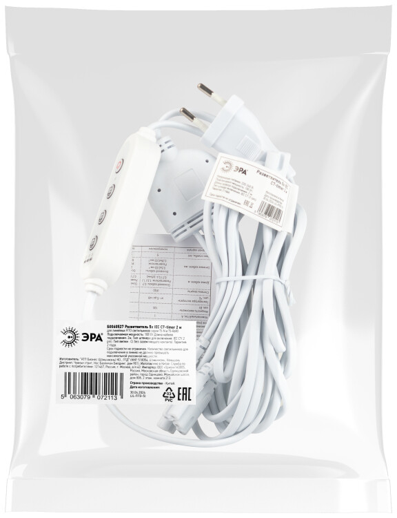 Технические характеристики: таймер времени, двойной штекер IEC 60320 C7, кабель 2х0,5 мм2, ПВС; для устройств II класса электробезопасности, без заземления; выдерживает нагрузку до 150 Вт. С помощью нового сетевого разветвителя от торговой марки ЭРА можно быстро и легко организовать комплексное освещение для большой площади. Одна розетка — и сразу 5 светильников.