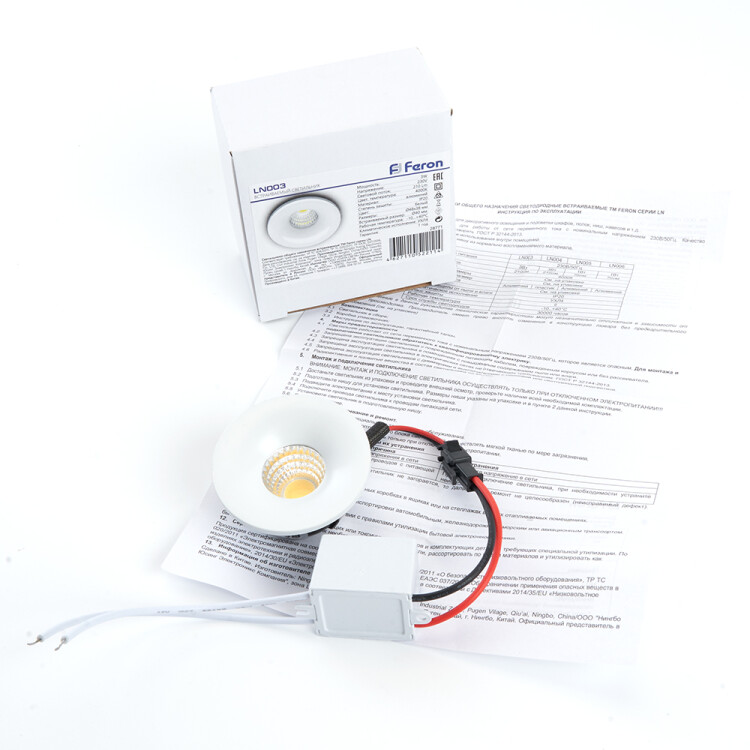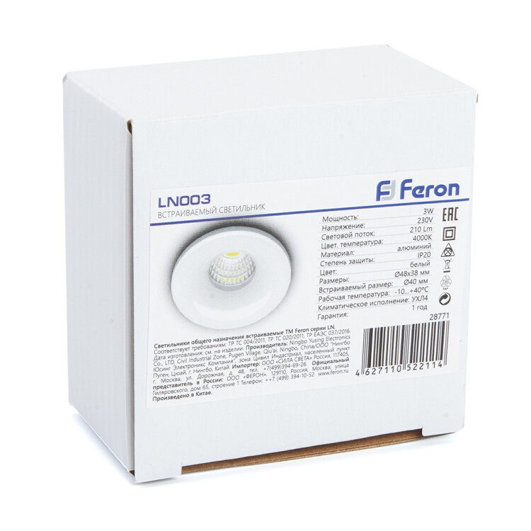 Светильник встраиваемый светодиодный, для подсветки мебели (ДВБ) FERON LN003, 3W 4000К (белый), 230V, 210Lm, IP20, цвет белый, корпус алюминий, рассеиватель акриловый полимер, 48*48*38 мм, монтажн.отв. 40 мм.