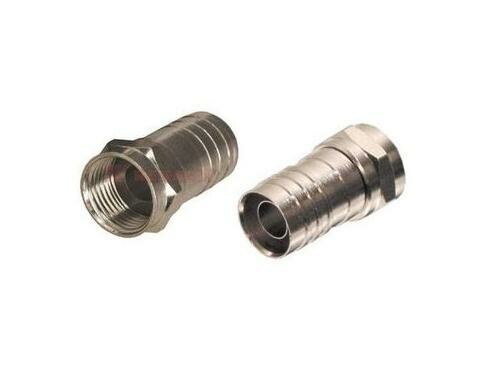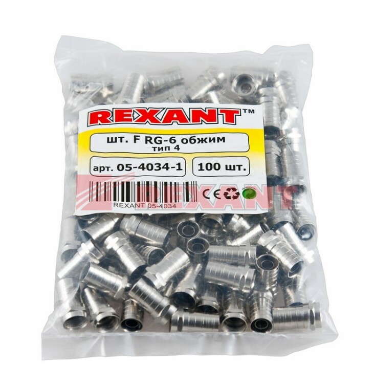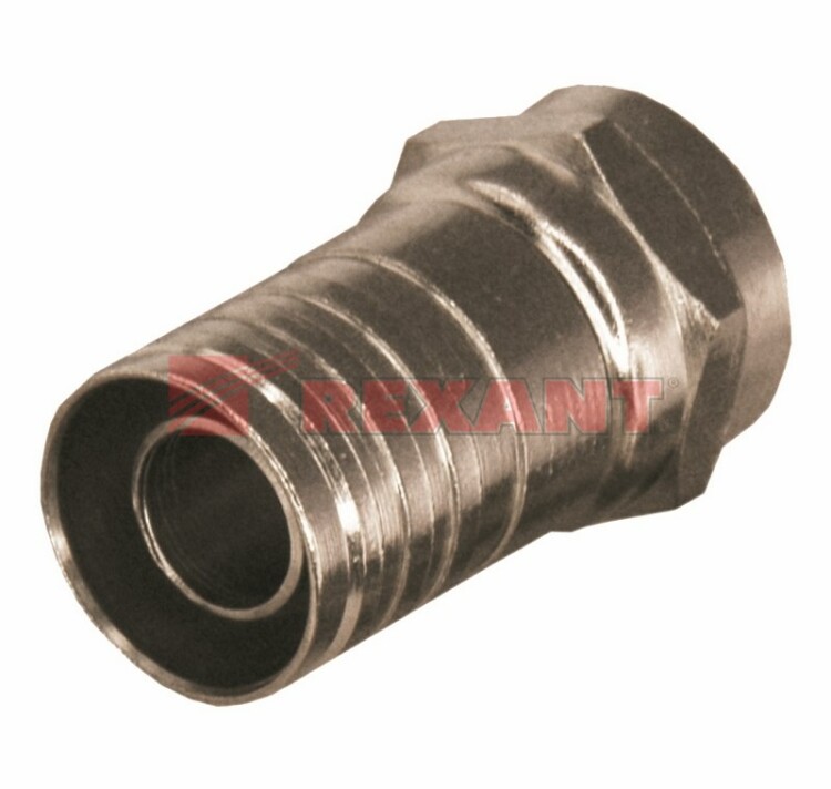F-разъем RG-6 REXANT соединяет коаксиальный кабель волновым сопротивлением 50 и 75 Ом с телевизионным и видеооборудованием, таким как ресиверы, телевизоры, видеоаппаратура и т.д. Изготовлен из никелированного сплава меди (биметалл).Разъем устанавливается на кабель путем обжатия, при котором втулка равномерно зажимает кабель по окружности.Перед монтажом необxодимо зачистить контакты с помощью специального обжимного инструмента.Такой высокочастотный соединитель подxодит для кабелей: SAT-50, SAT-703, DG-113, а также для другиx коаксиальныx кабелей, наружный диаметр которыx составляет около 6,8 мм.