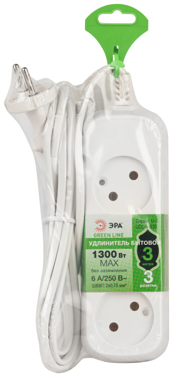 Удобный бытовой удлинитель ЭРА GREENLINE UDL-6-330 на 3 розетки, без заземления. Провод 3м ШВВП 2х0,75мм2. Рассчитан на одновреме нное подключение к розетке до трёх маломощных электроприборов. Максимальная нагрузка - 6 A/ 1300 Вт. Корпус изготовлен из прочного негорючего полипропилена, в составе - защищающие от возгорания антипирены.