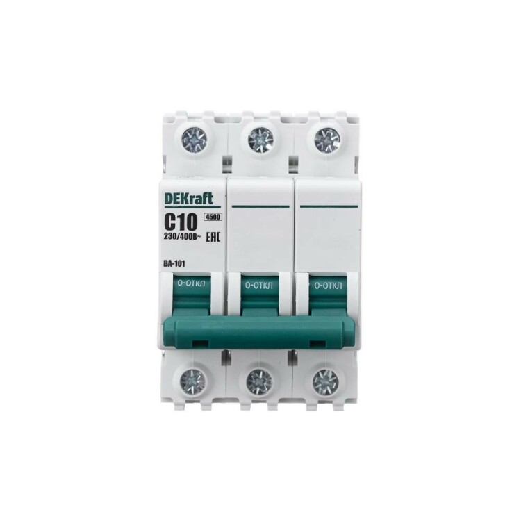 Автоматический выключатель серии ВА-101 Dekraft; 3P; номинальный ток 10 А; характеристика С; отключающая способность 4,5 кА. 5 монолитных заклепок повышают прочность корпуса аппарата. Сплошная лицевая панель обеспечивает безопасность эксплуатации аппарата. Боковые каналы охлаждения повышают стабильность работы при высоких температурах окружающей среды. Есть возможность установки дополнительных аксессуаров с левой стороны устройства. Аппарат на 100% совместим с корпусами Dekraft и Systeme Electric.