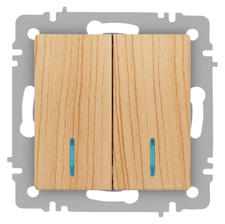Выключатель 2-клавишный с подсветкой серии Intro Accent скрытой установки механизм цвет сосна 6-105-11. Номинальные характеристики 10А 250В. Выполнен из негорючего термопласта, оснащён винтовыми клеммами. Парные клеммы обеспечивают соединение шлейфом. Монтаж в подрозетник производится и на лапки, и на винты. Рамка приобретается отдельно. В серии представлены рамки до 5 постов: на 1 пост - 6-501-хх, на 2 поста - 6-502-хх, на 3 поста - 6-503-хх, на 6 поста - 4-504-хх, на 5 постов - 6-505-хх (где хх - цветовой код: 01 - белый, 01М - матовый белый, 02 - слоновая кость, 03 - алюминий, 04 - шампань, 05 - антрацит, 06 - перламутр, 07 - графит, 08 - бронза, 09 - титан, 10 - венге, 11 - сосна).