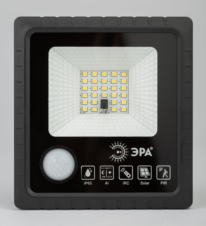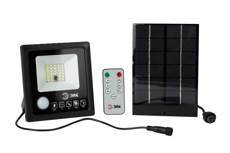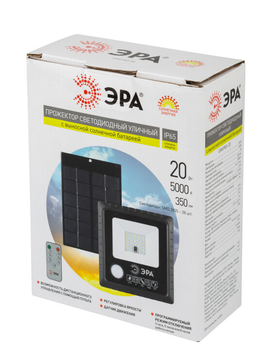 Cветодиодный уличный прожектор ЭРА ERAPRO-20 на солнечных батареях имеет высокую защиту от влаги и пыли (IP65) и функционирует в широком температурном диапазоне (от - 20 до + 50 градусов). В модель встроен морозоустойчивый сменный литий-ионный аккумулятор. Солнечная панель входит в комплект. Время полного заряда составляет 8 часов. В качестве источников света используются сверхъяркие светодиоды последнего поколения в количестве 28 штук. В прожекторе установлен датчик движения: освещение будет включено только в тот период, когда рядом находятся люди. Время до перехода в дежурный режим составляет 30 секунд. Датчик движения имеет возможность отключения. В комплекте поставляется пульт дистанционного управления, который позволяет на расстоянии включать и выключать свет, отключать датчик движения, устанавливать таймер работы, регулировать яркость. Уличный прожектор ЭРА ERAPRO-20 – верный выбор для подсветки дачной территории.