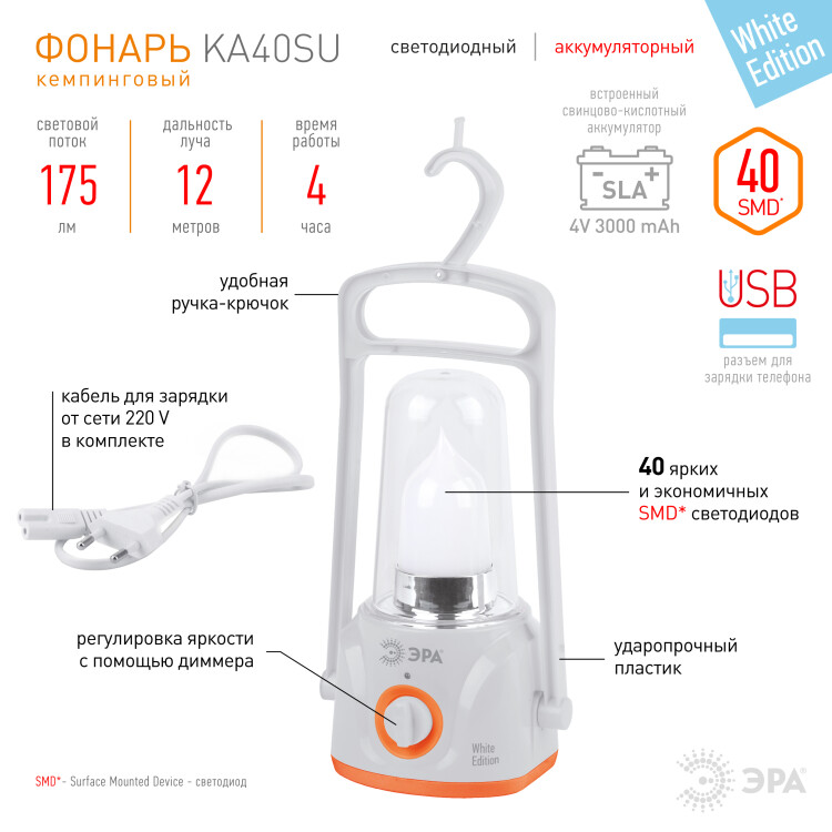 Аккумуляторный светодиодный фонарь KA40SU разработан для туристических походов, для тех, кто ведёт активный образ жизни и кому необходим дополнительный источник света во время прогулок и отдыха на природе. KA40SU представляет собой очень яркий фонарь, оснащённый 40 мощными диодами, которые закрыты "колпаком" - рассеиваетелем в классическом дизайне, напоминающим керосиновую лампу. Мощный аккумулятор обеспечивает 4 часа непрерывной работы и легко заряжается от обычной сети в 220 В. При этом от него легко можно заряжать смартфон, фонарь оборудован USB-разъёмом. Яркость освещения можно регулировать с помощью диммера. В экономном режиме фонарь работает до 10 часов без дополнительной зарядки. Фонарь разработан таким образом, чтобы в природных условиях стать практически универсальным помощником. В ручку встроен держатель, так что фонарь легко можно подвесить, например, на ветку. Специально сконструированная ручка фонаря делает его комфортным в переноске, так что его без проблем можно брать в прогулки. А в основании фонаря есть отверстие для крепления на стену. Функциональный дизайн делает фонарь очень удобным в эксплуатации, а качество исполнения - практичным. Корпус выполнен из ударопрочного пластика, так что случайные падения и царапины фонарю не страшны. Также стоит отметить качество светодиодов, ведь именно качество света важно для любого фонаря. В KA40SU используются SMD диоды - это диоды нового поколения, которые служат дольше и светят намного ярче. Свет от таких диодов белый, без синевы.