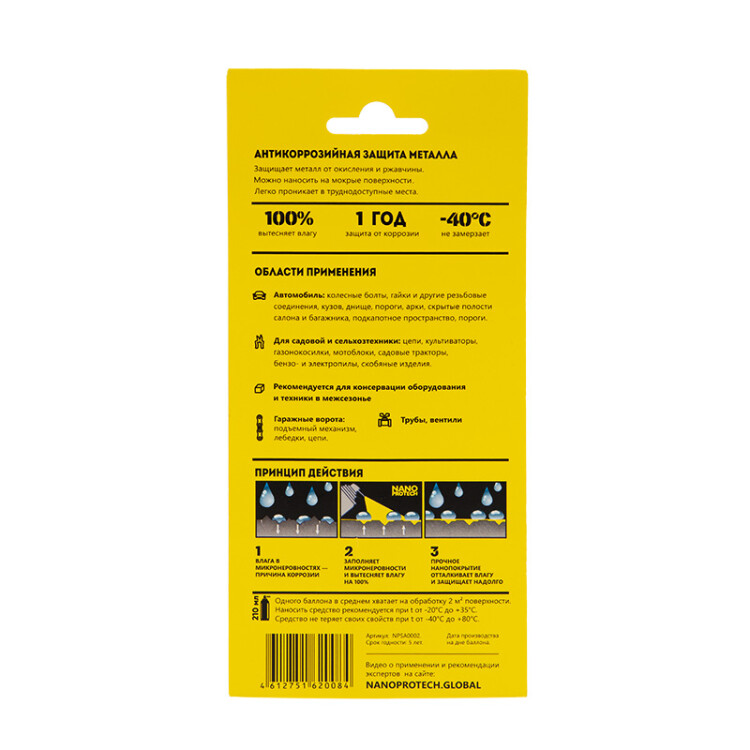 Продукт создает прочное невидимое нанопокрытие, которое минимум на 1 год защитит от ржавчины внешние и внутренние поверхности всех видов транспорта, а также промышленного, сельскохозяйственного и строительного оборудования.