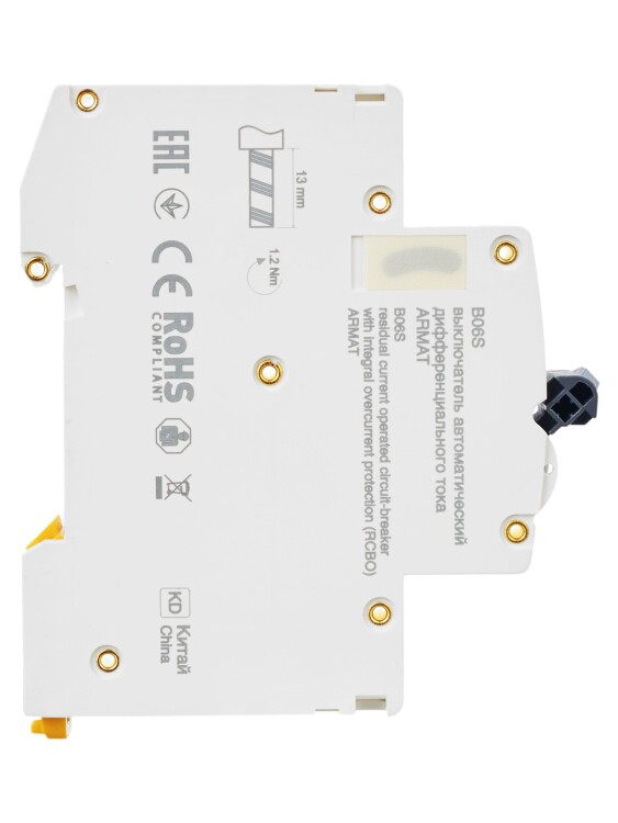 Автоматические выключатели д ифференциального тока (АВДТ) ARMAT серии B06S могут осуществляют функции защиты от токов перегрузки и короткого замыкания и защиты человека от токов замыкания на землю. Модельный ряд включает в себя устройства с номинальными токами от 6 до 32 А, характеристиками срабатывания по сверхтоку B и C, типами защит AC и A с номинальным дифференциальным током отключения 30 мА. Номинальная отключающая способность АВДТ ARMAT серии B06S составляет 6 кА.