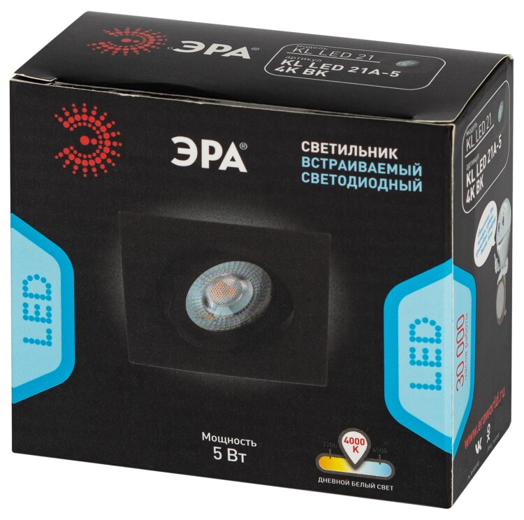 Поворотный светильник KL LED 21A-5 4K BK - идеальное решение для вашей комнаты. Светодиодный светильник можно использовать как в качестве главного освещения, так и для создания акцентов в определенных зонах комнаты. Благодаря скрытой части корпуса светильники можно встраивать в потолок или стены, создавая разный функционал помещений. Светильник ЭРА с ярким дизайном подойдет для помещений с разным интерьером: от минимализма до хай-тека, прованса или скандинавского стиля. Благодаря поворотному механизму у Вас появится уникальная возможность направлять свет в разные точки: например, на кухне осветить рабочую зону, а в кабинете место для чтения. Цветовая температура составляет 4000К, она оптимальна для глаз и не заставляет их испытывать дискомфорт. Максимальная мощность лампы – 5 Вт. Корпус встраиваемого светильника изготовлен из ударопрочного металла, что делает его особенно удобным в использовании. Диаметр отверстия, требуемого для установки светильника составляет 75 мм, а диаметр самого светильника – 90 мм. Купив точечный светильник бренда ЭРА, вы останетесь довольны и сможете создать уют в доме.