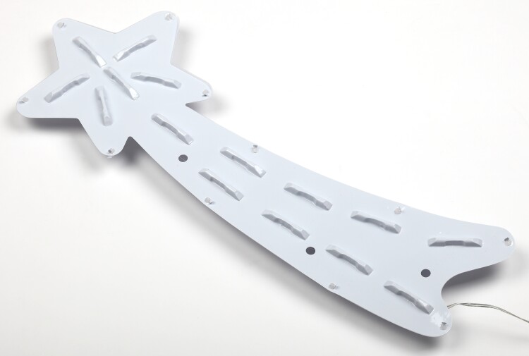Новогодняя настенная светодиодная фигура ЭРА "Комета" (арт. Б0041937) для праздничного декора внутри и снаружи помещений. Защищена от влаги и пыли (IP44), отличается морозостойкостью. Работает от стандартной электросети 220 В, прозрачный провод практически не заметен. Изготовлена из ударопрочного пластика. LED-фигура представляет собой комету, похожа на падающую звезду. можно вешать как нравится: звездой влево или звездой вправо. Светится тёплым белым светом, который создаёт атмосферу уюта. Дизайн фигуры идеально подходит к зимним праздникам. Размеры фигуры: 55 х 4,2 х 25 см. В качестве источников света применены 15 ярких и экономичных светодиодов, которые не перегреваются даже при длительной работе без перерывов. Новогодняя LED-фигура - простой и быстрый способ создать праздничное настроение, украсить дом, офис, общественное пространство.