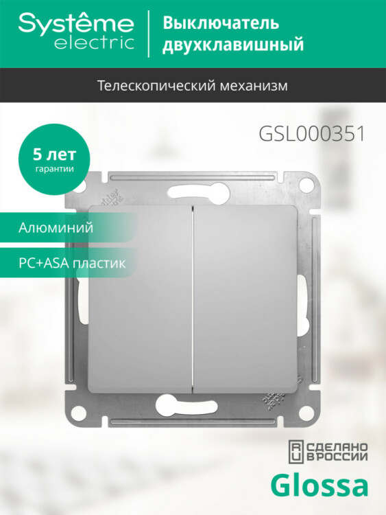 Механизм Systeme Electric (ранее Schneider Electric) серии Glossa (цвет алюминий) выключателя 2-клавишного подходит для сетей 250 В, на ток 10 А. Двухклавишный выключатель позволяет управлять двумя источниками света с одной точки. Выполнен из материала PС+ASA, стойкого к УФ-излучению и появлению царапин. Эргономичные клеммы расположены в два ряда: сверху и снизу.