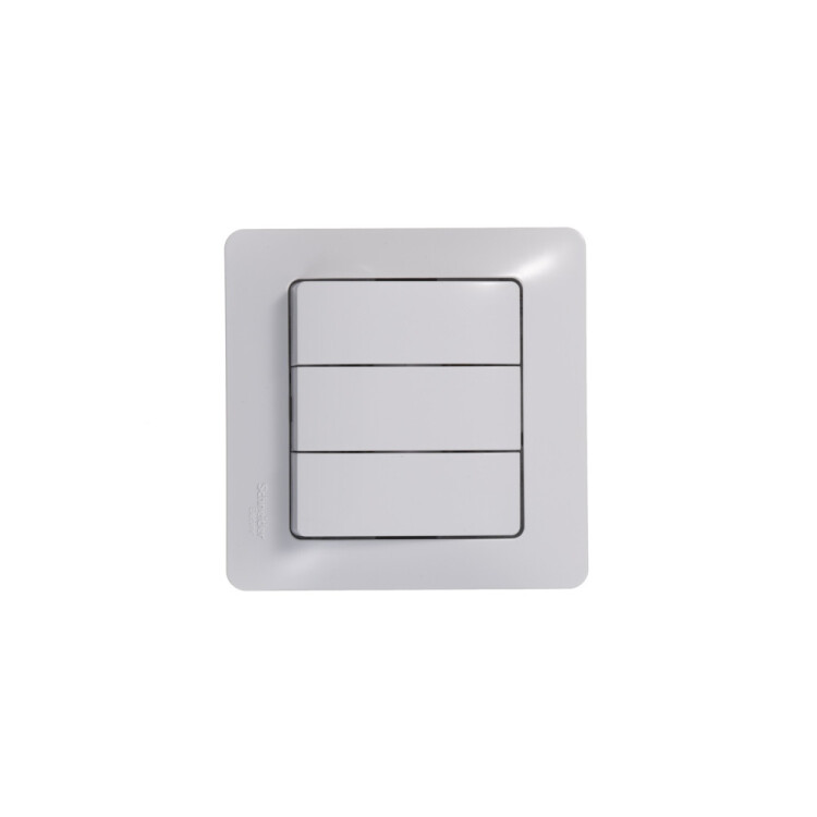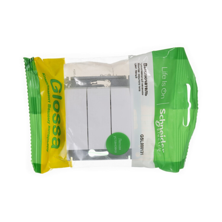 Механизм Systeme Electric (ранее Schneider Electric) серии Glossa (цвет белый) выключателя 3-клавишного подходит для сетей 250 В, на ток 10 А. Трёхклавишный выключатель позволяет управлять тремя источниками света из одной точки. Выполнен из материала PС+ASA, стойкого к УФ-излучению и появлению царапин. Эргономичные клеммы расположены в два ряда: сверху и снизу.