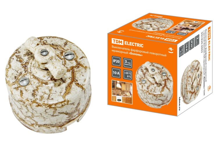 TDM Выключатель фарфоровый поворотный с ручкой (бантик) 10А мраморный «Болонь».