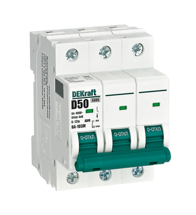 Автоматический выключатель без тепло защиты серии ВА-103M DEKraft; 3P; ном. ток 50 А; ном. раб. напряжение 400 В; кривая отключения D. Автоматические выключатели серии ВА-103М имеют специальное назначение для систем противопожарной защиты и вентиляции и выдерживают ток КЗ до 6000 А. Также они могут использоваться для нечастых оперативных включений и отключений указанных цепей. Автоматические выключатели соответствуют директиве RoHS, имеют расширенный диапазон рабочих температур от -25 до +60 °C, удобны и безопасны в эксплуатации.