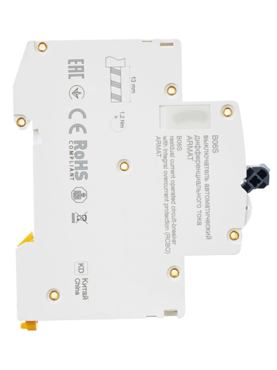 Автоматические выключатели дифференциального тока (АВДТ) ARMAT серии B06S могут осуществляют функции защиты от токов перегрузки и короткого замыкания и защиты человека от токов замыкания на землю. Модельный ряд включает в себя устройства с номинальными токами от 6 до 32 А, характеристиками срабатывания по сверхтоку B и C, типами защит AC и A с номинальным дифференциальным током отключения 30 мА. Номинальная отключающая способность АВДТ ARMAT серии B06S составляет 6 кА.