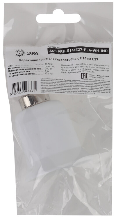переходник E14-E27 изготавливается из термостойкого пластика, материал химически устойчивый к агрессивным среда м, обладает высокой прочностью и теплостойкостью.