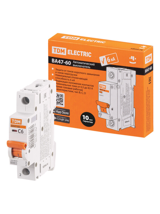 Применение:Вводно-распределительные устройства жилых и общественных зданий. Материалы:Корпус и детали выполнены из пластика, не поддерживающего горение.Маркировка выполнена в соответствии с требованиями ГОСТ и не подвержена стиранию в пределах срока эксплуатации.Преимущества:Высокая отключающая способность 6 000 АВыключатели ВА47-60 имеют возможность подключать U-образную шину с обеих сторон. Что позволяет подключать питание и разводить U шиной не только сверху, как у серии ВА47-29, но и подключать питание и разводить U шиной снизу. Для монтажников это означает значительно облегчение монтажа.Высокое токоограничение, ток при коротком замыкании не достигает своей максимальной величины, тем самым меньше нагревается электропроводка в момент КЗ, при сравнении с выключателями с отключающей способностью 4,5 кАДополнительные аксессуары к серии ВА47-60: контакт положения, контакт состояния, независимый и минимально-максимальные расцепители На лицевой панели расположен механический индикатор положения контактов. Особенностью данного индикатора является то, что даже при удержании рукоятки в положении включено, если контакты расцеплены, например, при расцеплении от независимого расцепителя, индикатор покажет положение расцеплено.Возможность пломбирования для защиты от несанкционированного доступа (заглушка поставляется отдельно).Высокий момент затяжки провода 3,5 Нм, что значительно больше, чем момент затяжки 2 Нм у всех 4,5 кА серий автоматических выключателей. Это позволяет надежно зажать провод, значительно снизить переходное сопротивление на клемме и тем самым уменьшить температуру выключателя, находящегося под нагрузкой. Назначение:Оперативное включение и выключение электрических цепейОтключение тока при коротких замыканиях или перегрузке.Проведение тока в нормальном режиме. 0: