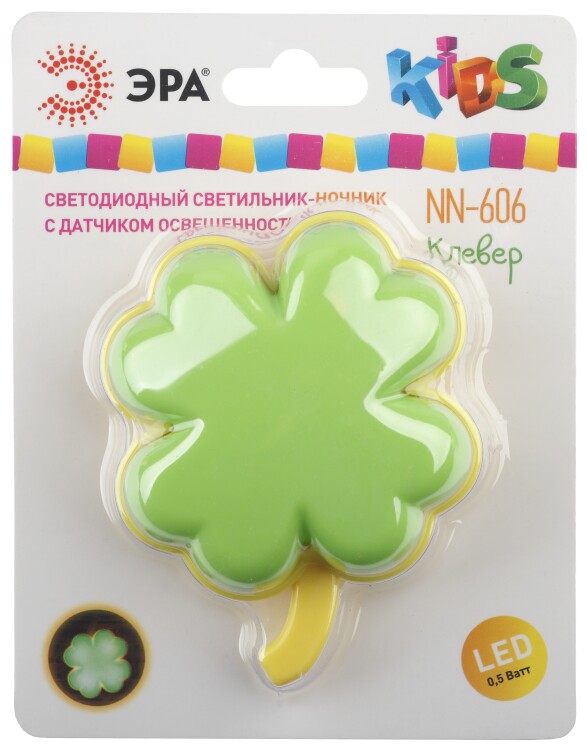 Ночник NN-606-LS-W "Клевер" со светодиодами (LED) в качестве источников света и встроенным датчиком освещенности. Включается автоматически, если вокруг темно, и так же сам гаснет с рассветом. Среди множества вариантов ночников миниатюрные модели, вставляющиеся в розетку - одни из самых удобных. Светодиодные ночники ЭРА успешно выполняют свою основную функцию - создают мягкий рассеянный свет. Они отличаются мизерным энергопотреблением, которое будет незаметно в общем счете за электроэнергию. При необходимости можно смело оставлять их включенными ночи напролет. Современная LED технология исключает пульсации света, освещение ровное и приглушенное - то, что нужно для комфортного сна или ночной подсветки. Упаковка позволяет проверить работу ночника, не доставая его из блистера, нужно только включить его в розетку и прикрыть датчик освещенности рукой.