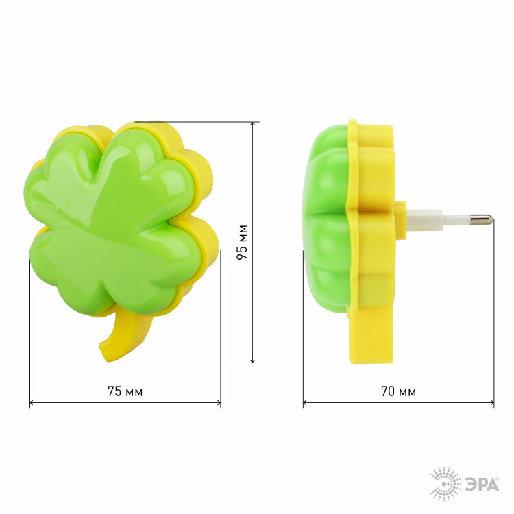 Ночник ЭРА в виде листика клевера - идеальный подарок для ребенка. Детский светодиодный ночник светильник в розетку с датчиком освещенности ЭРА представлен в 7-ми вариациях: модель NN-605-LS-W – Облачко; модель NN-626-LS-Y – Бычок, модель NN-601-LS-R - Божья коровка; модель NN-607-LS-BU – Воздушный шар; модель NN-603-LS-W – Белый мишка; модель NN-606-LS-W – Клевер; модель NN-631-LS-P – Хрюшка.