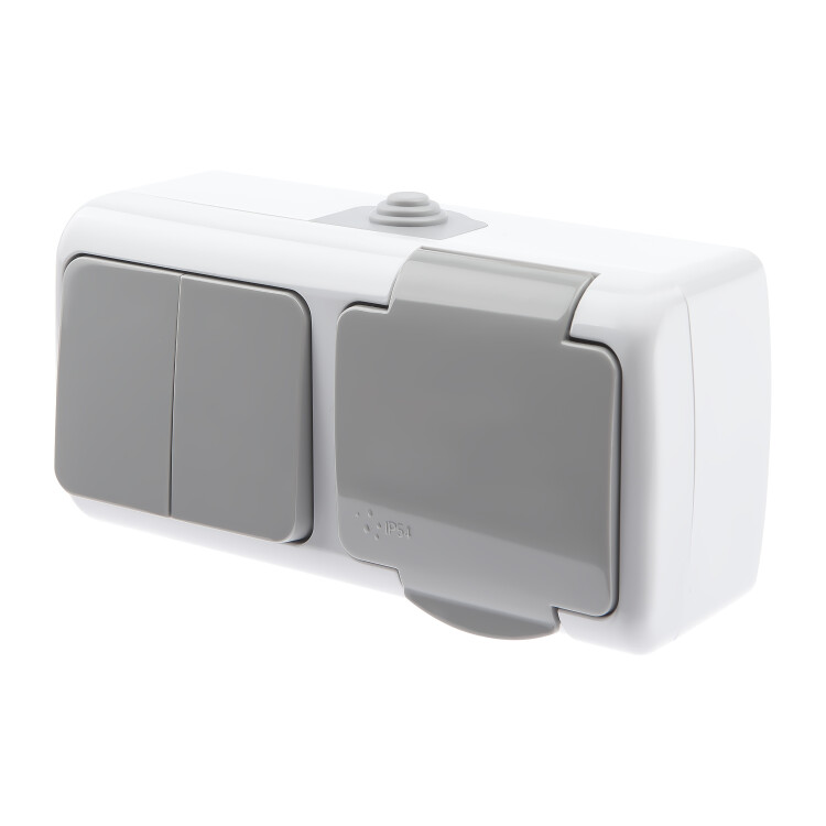 Блок розетка 2P+E + выключатель двойн., 10(16)А-250В, ОУ, Atlantic, IP54, серый
