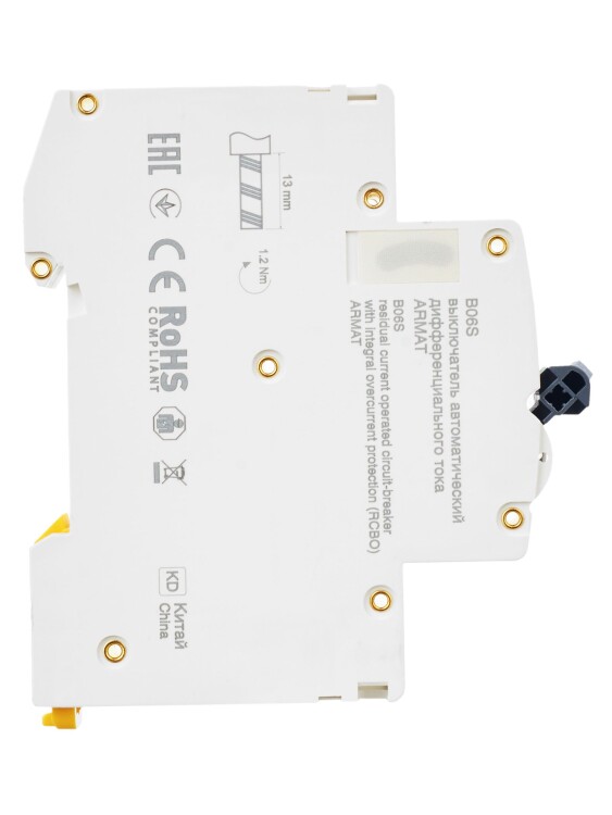 Автоматические выключатели д ифференциального тока (АВДТ) ARMAT серии B06S могут осуществляют функции защиты от токов перегрузки и короткого замыкания и защиты человека от токов замыкания на землю. Модельный ряд включает в себя устройства с номинальными токами от 6 до 32 А, характеристиками срабатывания по сверхтоку B и C, типами защит AC и A с номинальным дифференциальным током отключения 30 мА. Номинальная отключающая способность АВДТ ARMAT серии B06S составляет 6 кА.