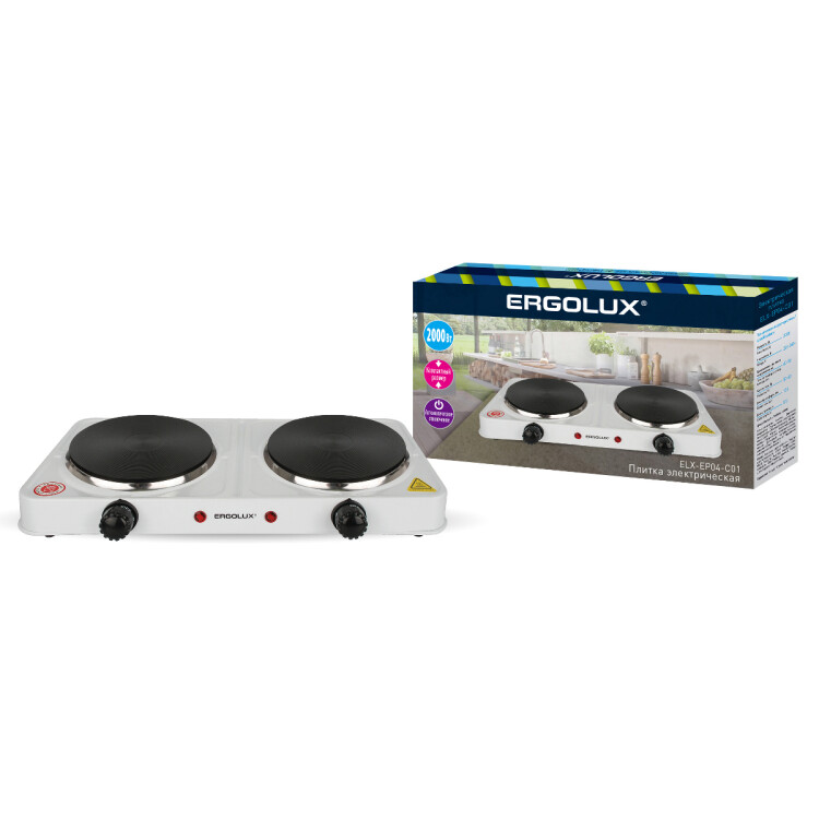 ERGOLUX Электроплита ELX-EP04-C01 белая (2 конф., дисковый нагр.эл.2000Вт, 220-240В) (1/6)