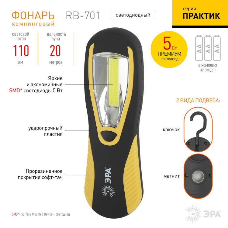ЭРА RB-701 Фонарь Рабочий серия "Практик" [5Вт COB, 3xAA, крючок, магнит, бл]