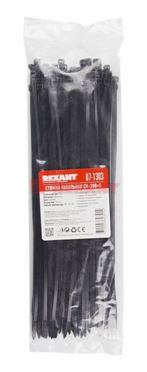 REXANT Хомут-стяжки кабельные нейлоновые 300x4.8 мм, черные, упаковка 100 шт..