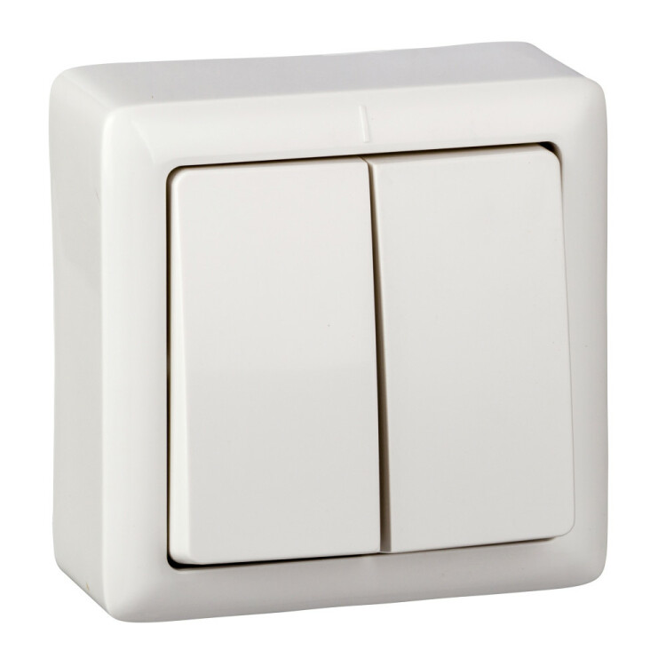 Выключатель двухклавишный Systeme Electric (ранее Schneider Electric) ХИТ (открытой установки, цвет белый) предназначен для сетей до 250 В, на ток до 6 А. Выключатель изготовлен из ABS-пластика, прост в установке, прочен и надежен в применении. Двухклавишный выключатель позволяет управлять двумя источниками света с одной точки. Сделано в России.