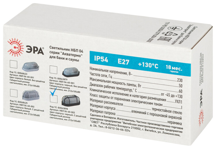 Термостойкий светильник серии "Акватермо". Так называемые светильники-банники имеют специальную конструкцию, позволяющую эксплуатировать эти модели на объектах с повышенным уровнем влажности - бани, бассейны, автомойки, склады, гаражи. Серия "Акватермо" представлена в широком диапазоне параметров (мощность, размеры), некоторые модели дополнены защитной решеткой. Выпускаемые пылевлагозащищенные светильники отличаются надежностью, практичностью, безопасностью, устойчивостью к агрессивным климатическим и механическим воздействиям. Имеют широкий диапазон рабочих температур: от -45°С до +130°С. Материал рассеивателя: селикатное стекло. Материал корпуса: черный алюминий. Источник света: лампа с цоколем Е27. Степень защиты от окружающей среды - IP54.