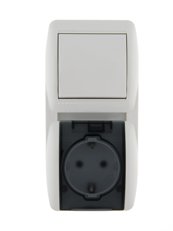 Lezard Ната белый Выключатель и розетка с/з, с крышкой, вертикальная 1/10/120
