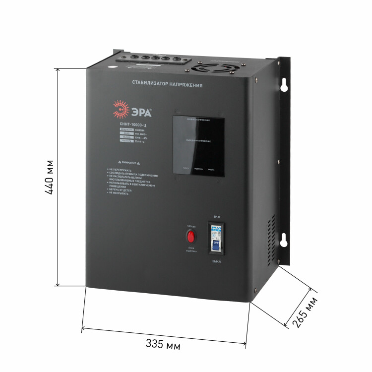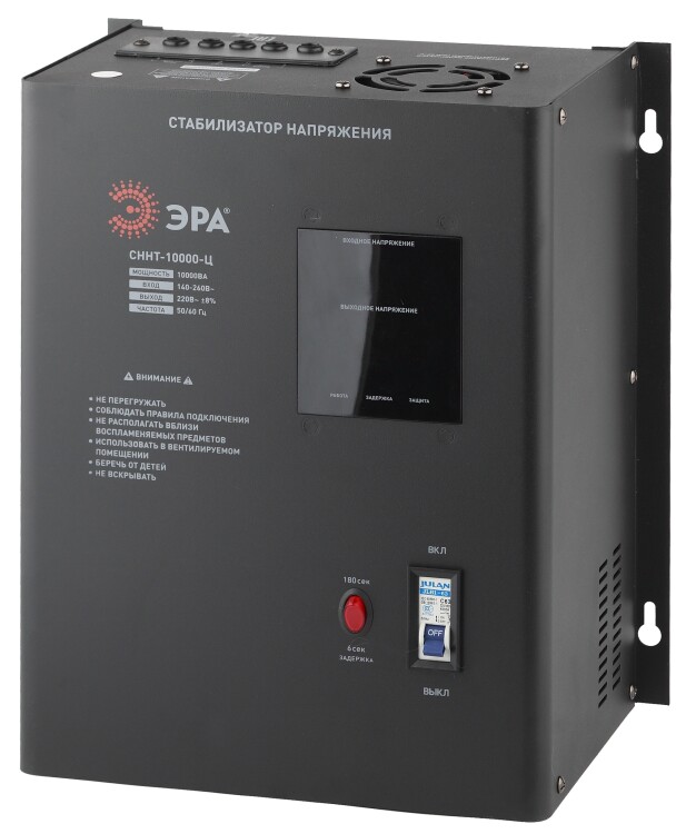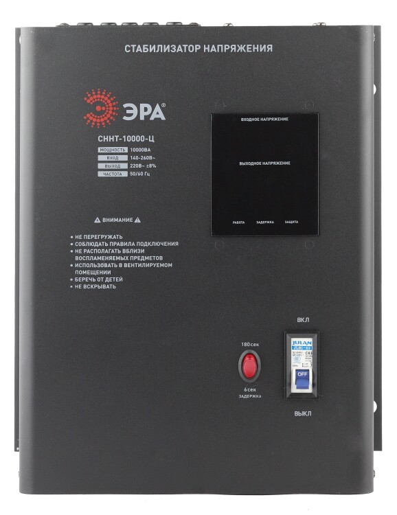 Стабилизатор напряжения настенный однофазный релейный цвет чёрный модели СННТ-10000-Ц. Номинальные характеристики (полная мощность / диапазон входного напряжения): 10000ВА 140-260В . Предназначен для поддержания стабильного однофазного напряжения питания бытовых приборов при отклонениях значений сетевого напряжения. Выбирая стабилизатор, нужно знать, какое электрооборудование будет к нему подключено: один прибор, группу приборов (наиболее чувствительных к перепадам напряжения в сети) либо вся домашняя (офисная) техника. Затем необходимо рассчитать суммарную мощность защищаемых электропотребителей. Основное условие выбора мощности стабилизатора напряжения - суммарная мощность подключаемой к нему нагрузки не должна превышать полной мощности самого стабилизатора (в противном случае автоматика стабилизатора будет их просто отключать). Точные значения мощности можно узнать из паспортных данных Вашего конкретного потребителя. Стабилизатор подбирается с запасом в 25-30% к его полной мощности.