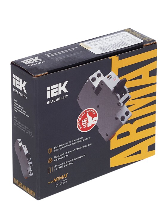Автоматические выключатели д ифференциального тока (АВДТ) ARMAT серии B06S могут осуществляют функции защиты от токов перегрузки и короткого замыкания и защиты человека от токов замыкания на землю. Модельный ряд включает в себя устройства с номинальными токами от 6 до 32 А, характеристиками срабатывания по сверхтоку B и C, типами защит AC и A с номинальным дифференциальным током отключения 30 мА. Номинальная отключающая способность АВДТ ARMAT серии B06S составляет 6 кА.